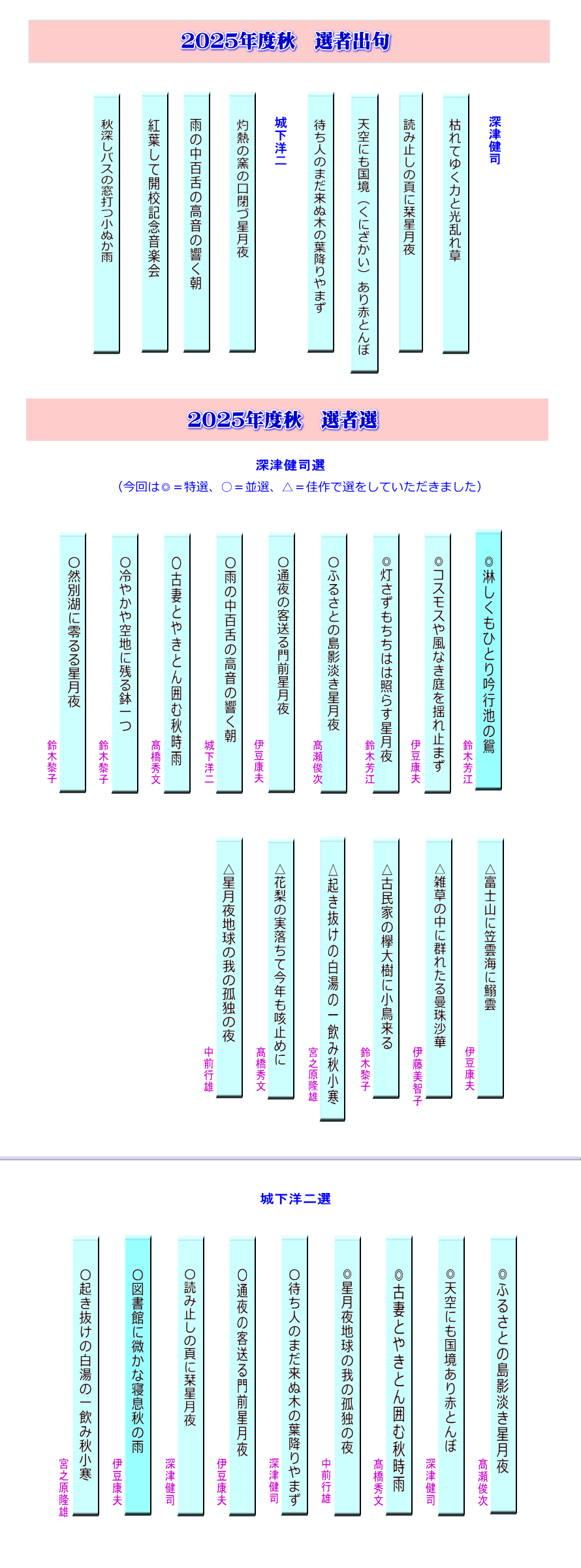 今回、句会参加者はそれぞれが良いと思った句を5句ずつ選びました。